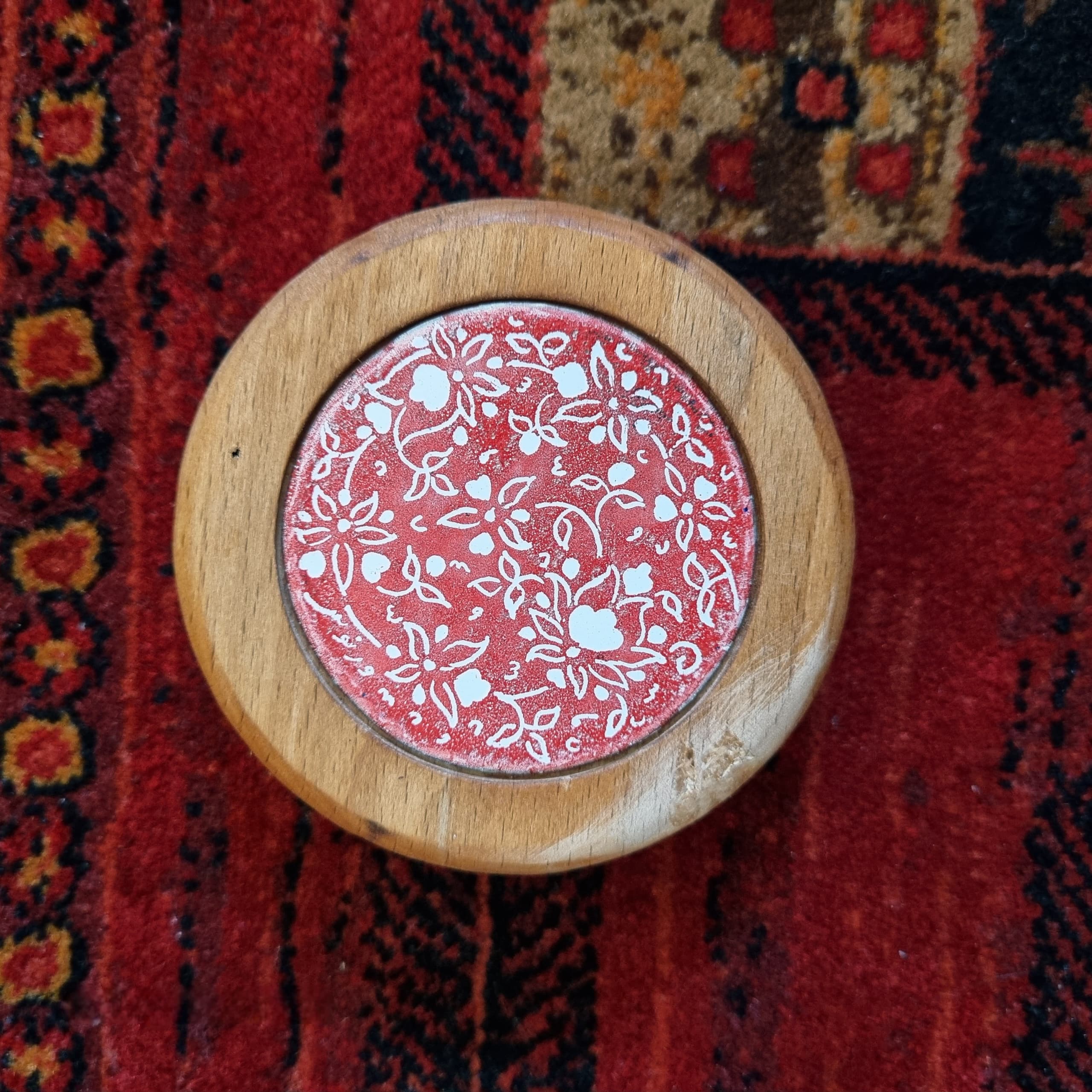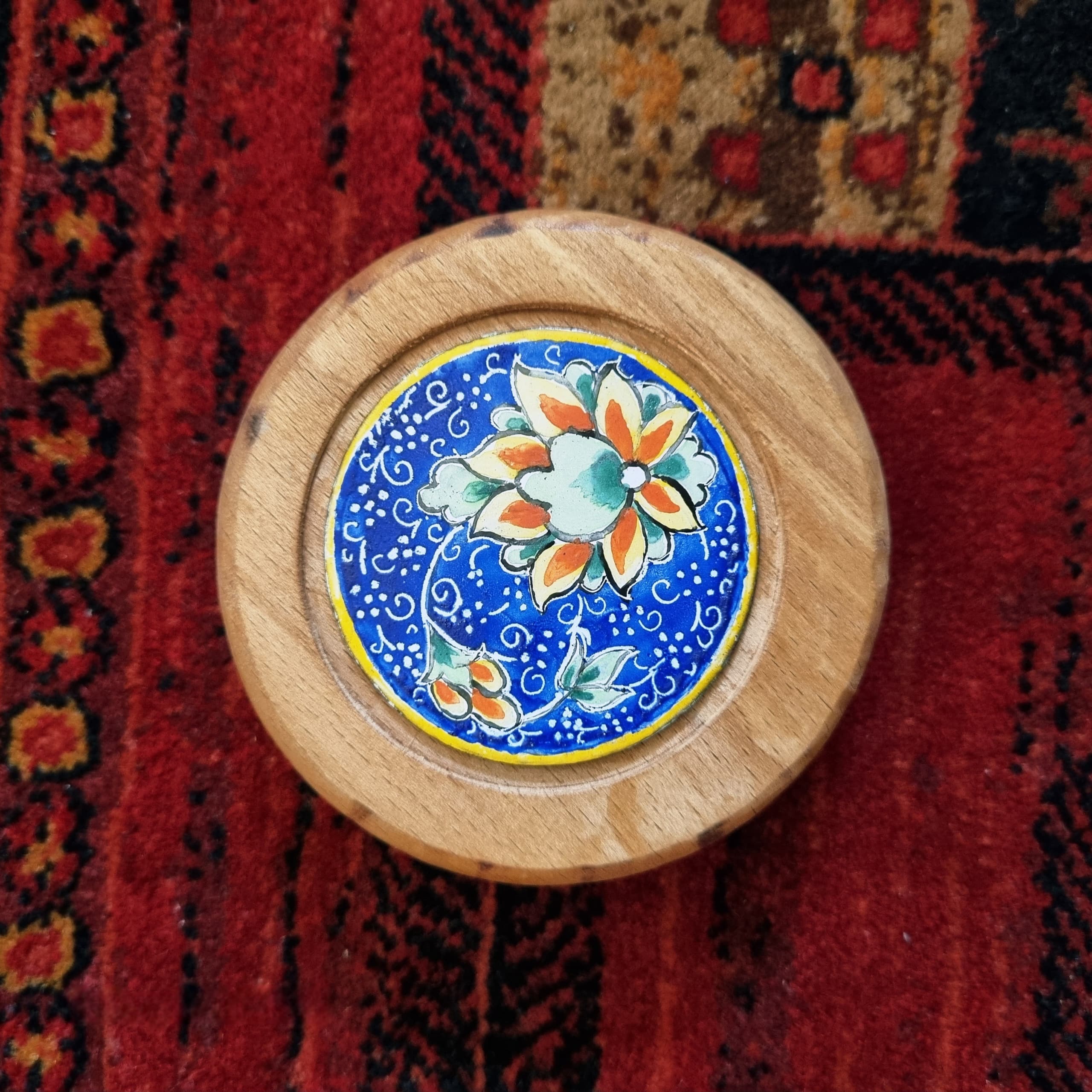 آینه جیبی میناکاری با جنس بدنه چوب است.قسمت میناکاری دردل چوب کارشده است.دراین محصول از مس وچوب استفده شده است.ست آینه وشانه هم درسایت موجود است.
